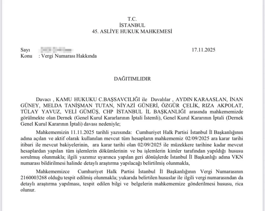 İstanbul 45. Asliye Hukuk Mahkemesi’nin, ilgili bankalara gönderdiği yazıda, CHP İstanbul İl Başkanlığı adına açılan ve aktif olarak kullanılan mevcut tüm hesapların mevcut bakiyelerinin, mevcut hesaplardan yapılan tüm işlemlerin dökümlerinin ve bu işlemlerin kimler tarafından yapıldığının bildirilmesi talep edildi.
